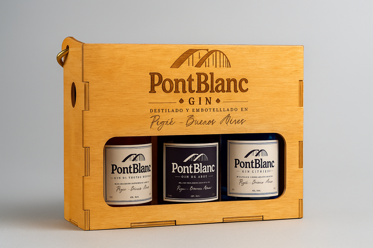 Tripack de Madera Pont Blanc incluye tres botellas de 375 ml (Gin London, Cítrico y frutos rojos) en una caja de madera exclusiva, pensada para regalar o disfrutar una selección variada de nuestros gins artesanales.