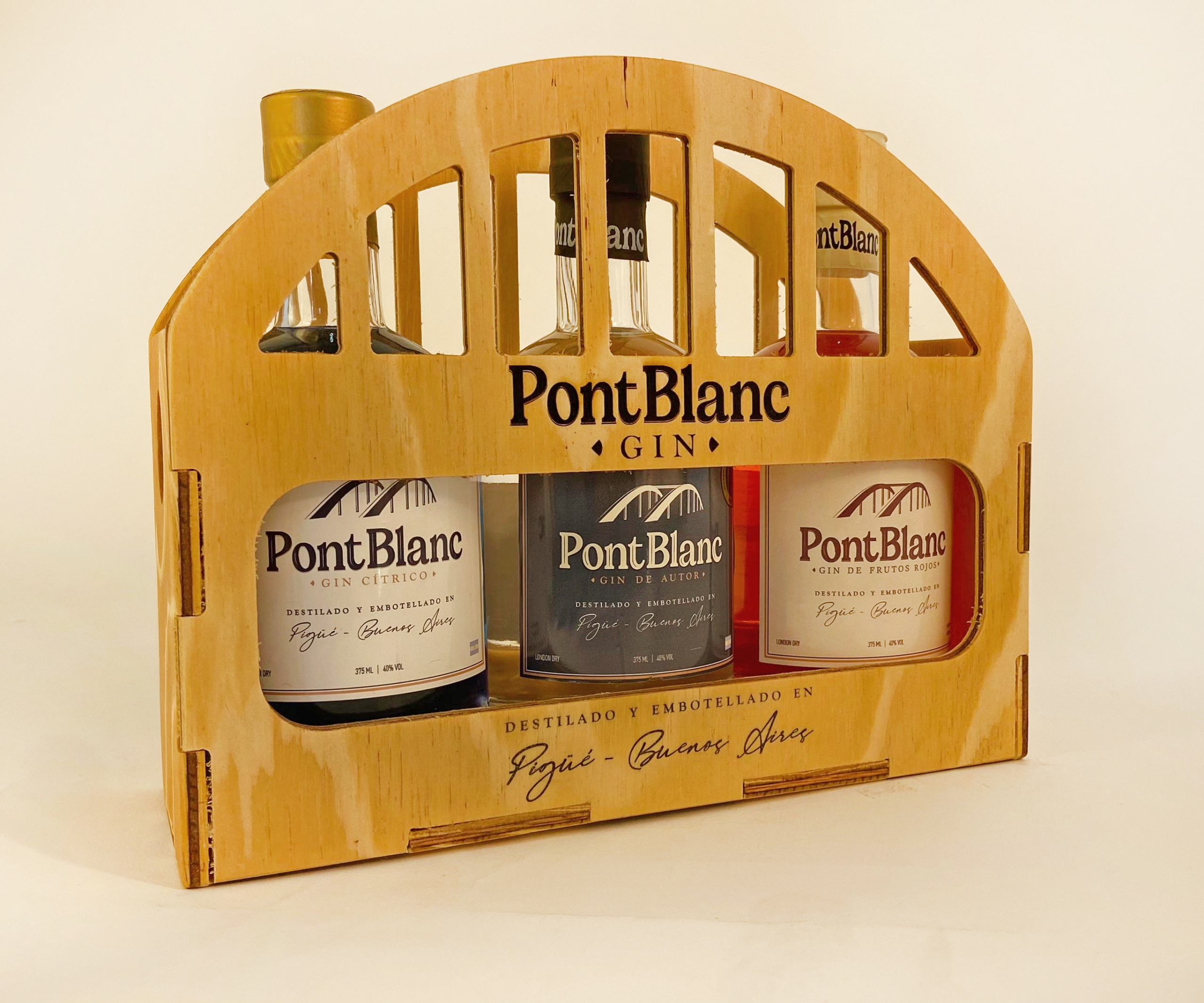 Tripack de Madera Pont Blanc incluye tres botellas de 375 ml (Gin London, Cítrico y frutos rojos) en una caja de madera exclusiva, pensada para regalar o disfrutar una selección variada de nuestros gins artesanales.